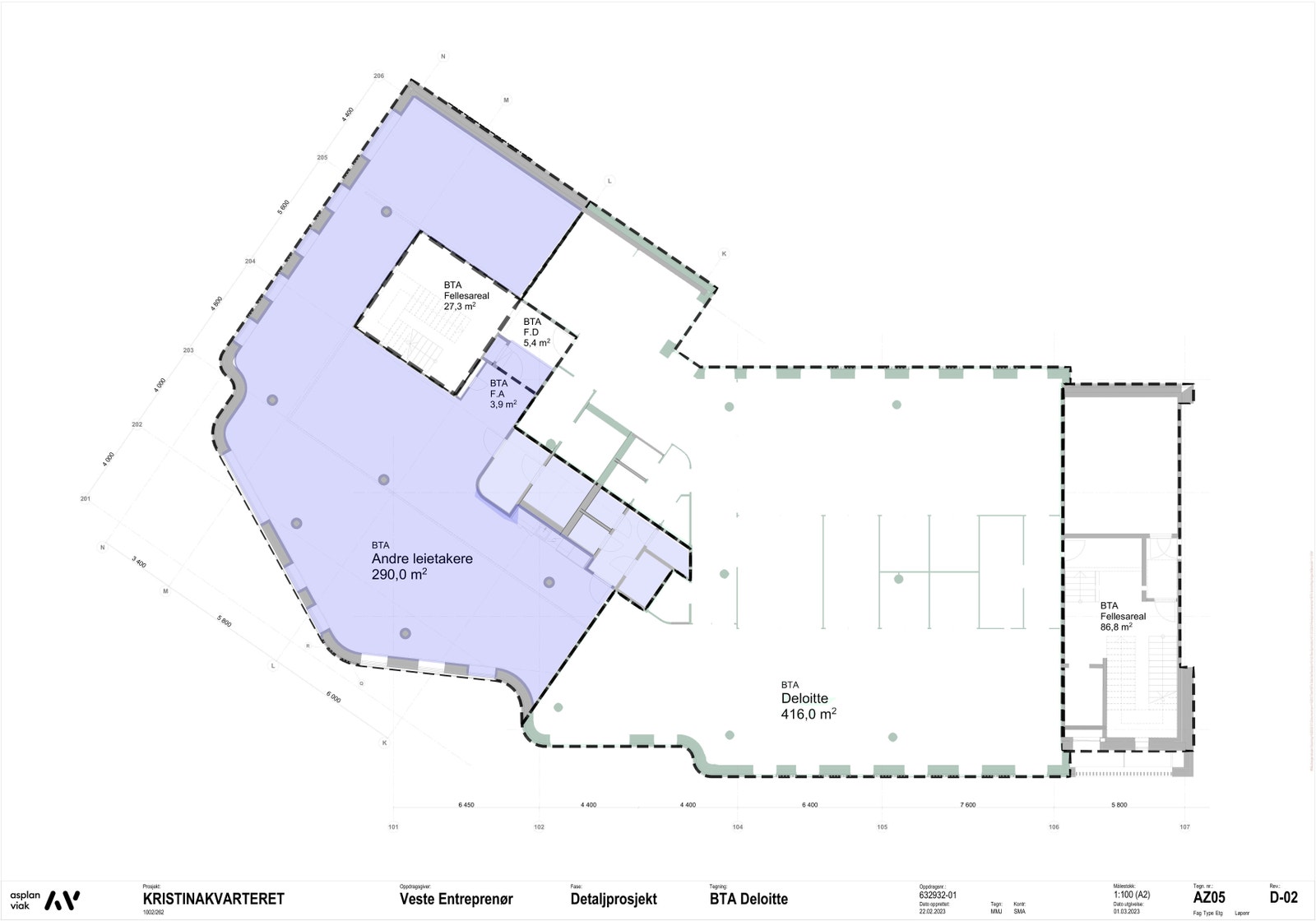 Beliggende i 5. etasje, passer lokalet perfekt for både åpent landskap, cellekontorer eller en kombinasjon av begge. Det ledige arealet er tydelig markert i blått på plantegningen.